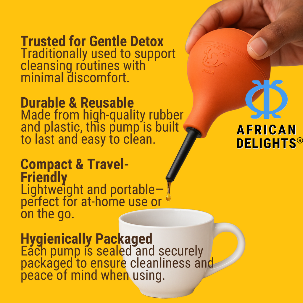 Introducing the African Detox Pump, a complete enema solution in a disposable squeeze bottle. Use it with water or your own African herbal water for a gentle and effective cleanse. Its soft tip and convenient design make it easy to use and dispose of.