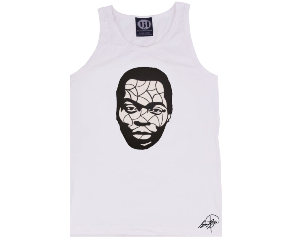 Handmade by Dope by Default. A double-layered exquisite hand cut of the Nigerian pioneer of Africa’s afrobeat, Fela Kuti. This design features 2 bold coloured pieces of leather artistically arranged to form a portrait of the Legend. This classic black & white mosaic design is carefully hand stitched on a white 100% cotton tank top.