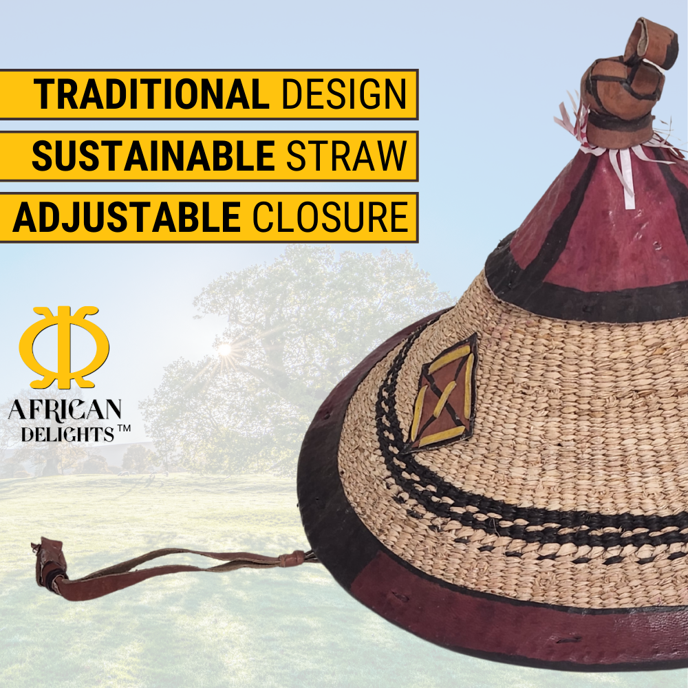 The design is inspired by the Fulani people, a tribe from West Africa known for their unique and iconic attire. The hat features a basketry construction made of durable plant fibers and a genuine leather top knob brim, enhancing its aesthetic detailing. The African hat's conical shape ensures it fits any size, making it versatile for all. It also comes with a leather adjustable strap for comfort and a secure fit.